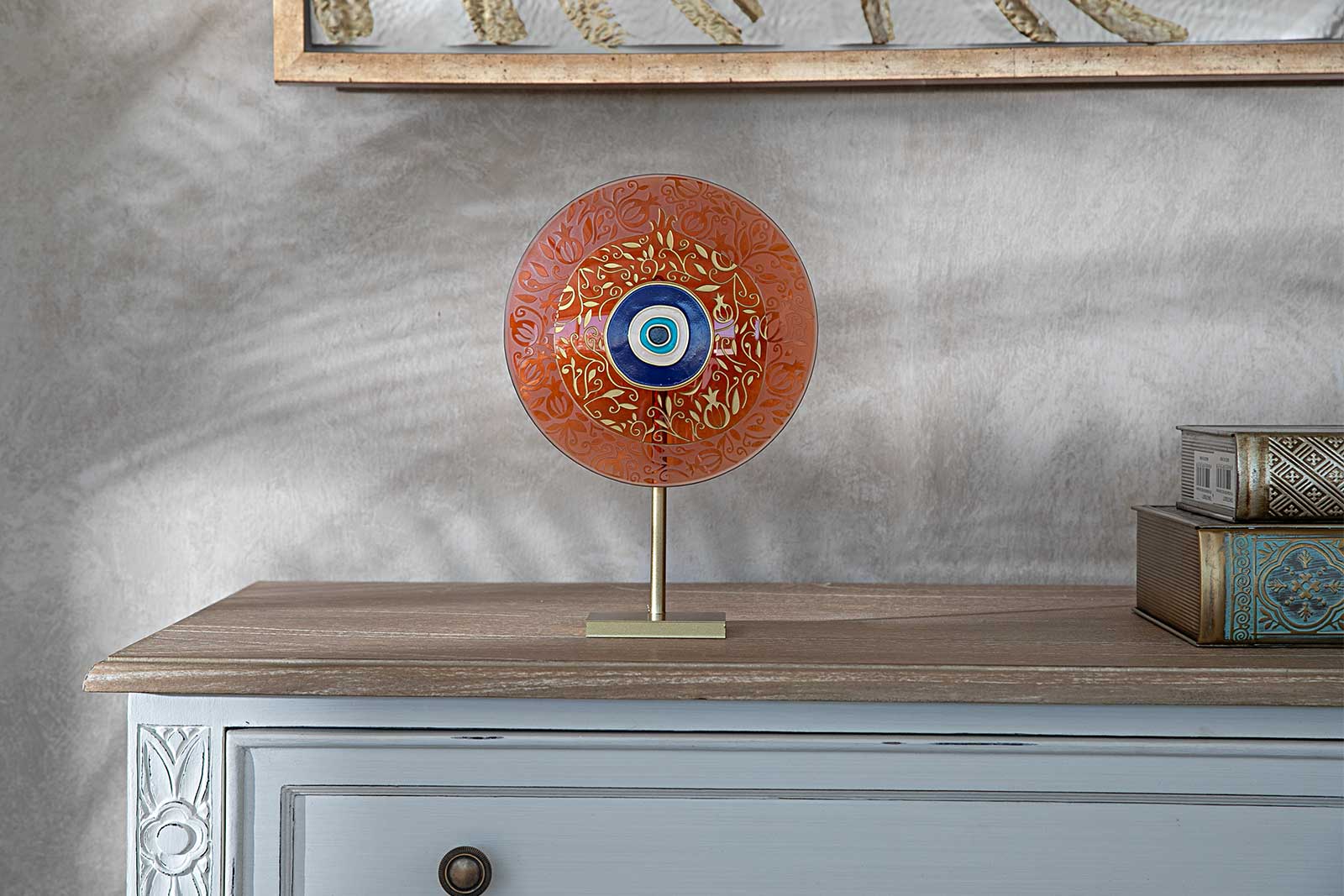 Ürün materyali; camdır. Ayak metaldir. %100 el yapımıdır. Nemli bir bez ile tozu alınmalıdır. Bu ürün aynı zamanda duvar dekoru olarakta kullanılabilir. Ürünün arkasında, duvara asma aparatı bulunmaktadır. Ayaklı metal parça, döndürülerek çıkarılabilir. Bu sayede ürünü duvara asabilirsiniz.