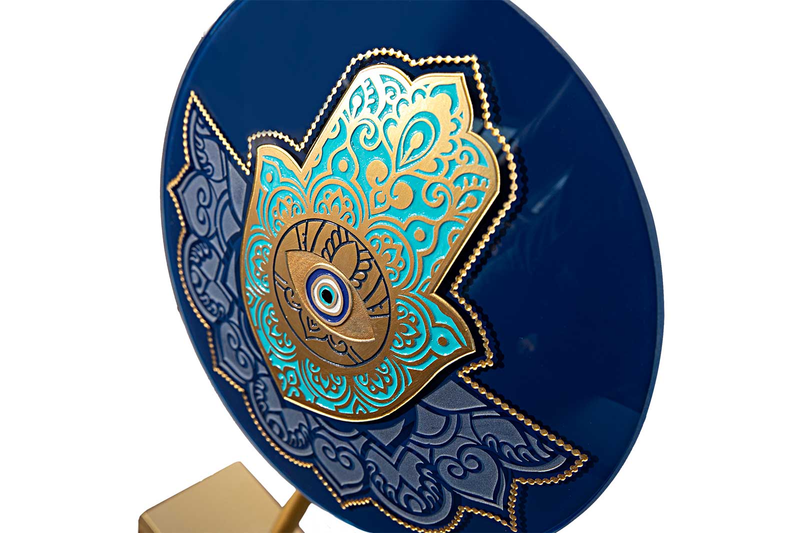 Ürün materyali; camdır. Ayak metaldir. %100 el yapımıdır.Nemli bir bez ile tozu alınmalıdır. Bu ürün aynı zamanda duvar dekoru olarakta kullanılabilir. Ürünün arkasında, duvara asma aparatı bulunmaktadır. Ayaklı metal parça, döndürülerek çıkarılabilir. Bu sayede ürünü duvara asabilirsiniz.